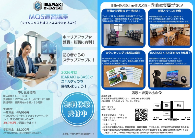 「IBARAKI e-BASE」では、MOS資格取得を短期集中で目指せる「MOS速習講座」を開講しており、あなたの新しい挑戦を力強くサポートします。